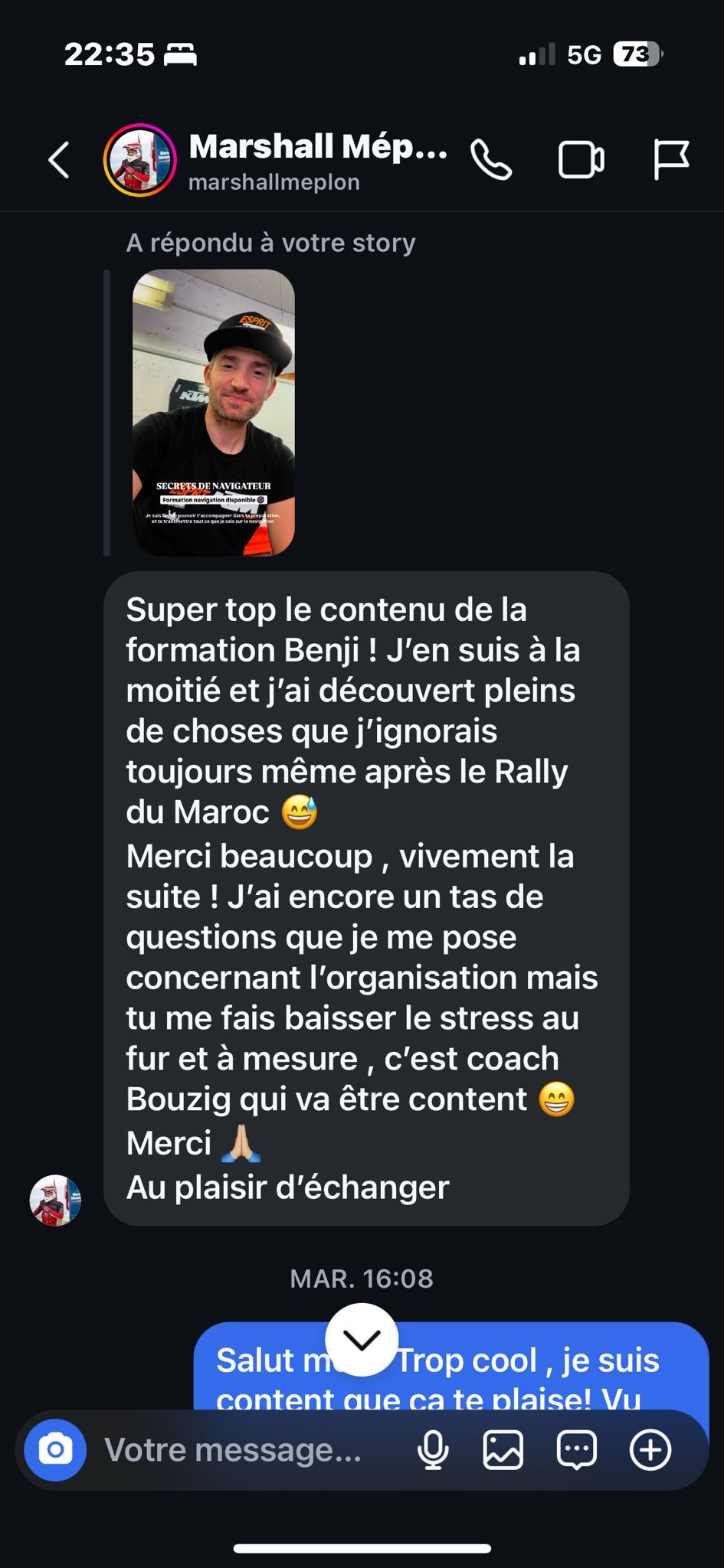 Tu pourras me poser toutes tes questions (rallye raid ou autre !). On pourra aller plus loin sur tes besoins spécifiques pour ton prochain rallye.